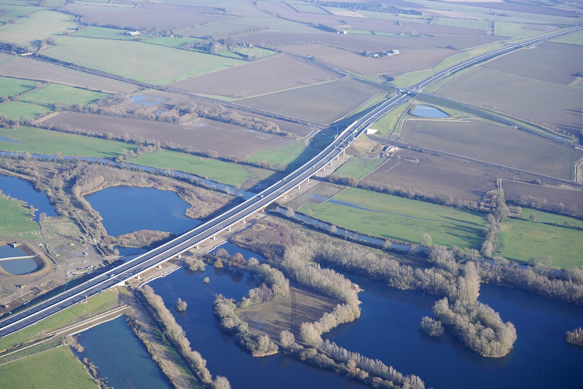 The River Great Ouse viaduct required 6,000 tonnes of steel, comprising 76 separate main girders and 800 cross girders. The ladder deck bridge spans the river itself and a large area of floodplain on either side. Supported on 16 pairs of piers, most of the main girders required were 40m-long, 2m-deep and weighed 50 tonnes. The section of bridge that crosses the river has a longer span requiring more complex girders, with larger, deeper haunches to carry the greater load.