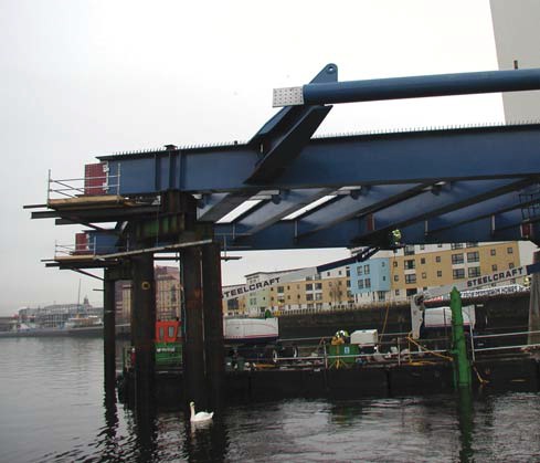 The nine arch pieces were delivered, assembled and welded on the deck into three large sections each weighing 150 tonnes. Two 500 tonne capacity cranes were then used to tandem lift the three sections onto the temporary trestles. The support trestles were then de-jacked and removed and the hangers installed. Finally the deck weight was transferred to the hangers and arch and the temporary supports in the river removed. The whole of the superstructure was completed between November 2005 and June 2006.