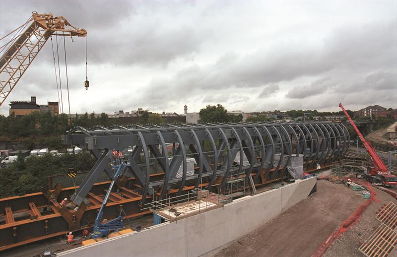 The structure was assembled online adjacent to its final position using a combination of site welding and bolted joints, and then launched across the busy East Coast Mainline during a 72-hour possession at Christmas 2003, to minimize disruption to rail users.