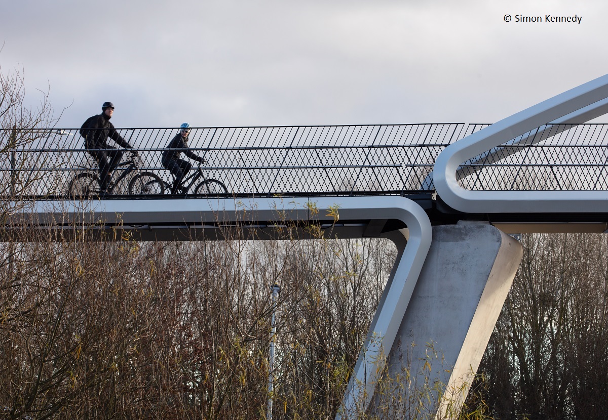 An excellent example of how inspired architectural details can create a ‘statement’ bridge. Simply rotating the square cords through 45 degrees has produced a dramatic shadow line. This, coupled with clever detailing at the supports, gives a pleasing slender floating expression to the bridge. Installation of the main span in just two hours minimised disruption to the busy junction below.