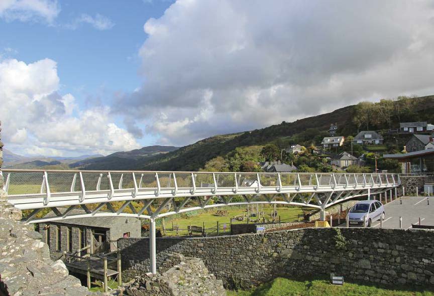 To minimise the impact of the views of the distant mountains of Snowdonia, the profile of the bridge was reduced by tapering the bottom chords of the trusses and eliminating any diagonal bracing, thus avoiding a potentially more cluttered appearance. The visual lightness of the bridge is significantly improved by the selection of a stainless steel mesh infill to the parapets. The deck is 2m wide in general, however it widens up to 3m above the middle support to provide an area where people can enjoy the views.