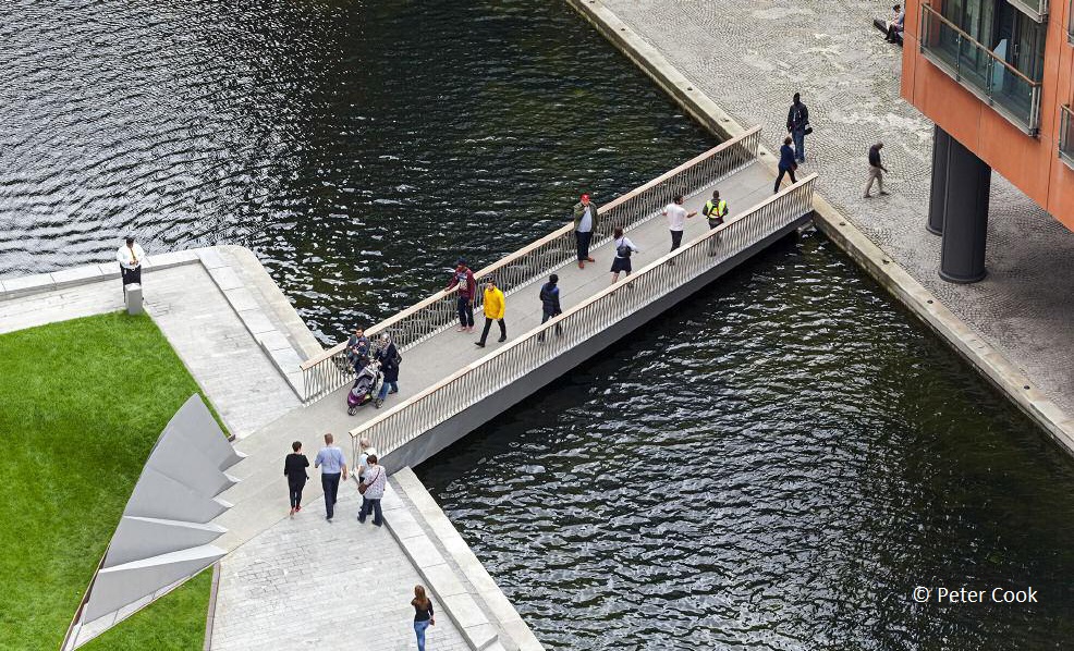 The new footbridge over Paddington Basin is formed of five ‘fingers’ which are each raised by hydraulic rams, and rotate about an axis on one side of the basin.