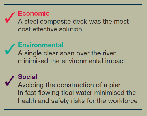 The original plan for this crossing was a two-span bridge similar to an existing adjacent structure. However, the high strength to weight ratio of steel meant that a single span was feasible. Avoiding the construction of a pier in the fast flowing tidal river minimised the cost, environmental impact and the