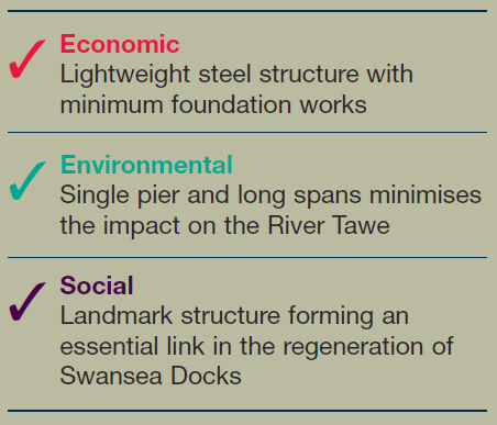 cable-stayed structure comprises a 140m long steel deck supported by 70mm diameter spiral strand stay cables connected to a 42m high steel mast. Steel was key to the success of the very short programme (concept to completion in 15 months), and the formal clarity and final surface finish. Opened in June 2003 for the inaugural ‘Great West Wales Triathlon’, this bridge has become a popular icon for the region and a destination in its own right as well as an essential link between the Port Tawe Innovation Village and the City Centre.