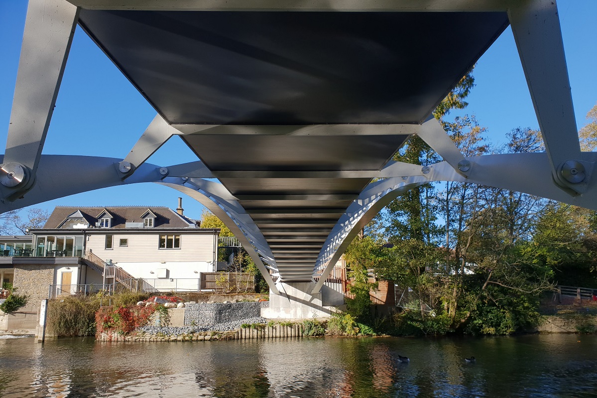 The slender arches drew inspiration from the nearby Maidenhead Railway Bridge by Brunel, famously employing the ‘flattest brick arches in the world’. The arches are triangular in cross section and lean outwards to produce a dramatic visual effect, opening up the views from the bridge of the river and surrounding landscape. The arch geometry was devised to avoid double curvature to facilitate fabrication from steel plate, and the triangular shape results in a much greater transparency, emphasising the slenderness of the design. The white colour of the arch was chosen to stand out from the natural backdrop, whilst adding to the slender appearance and giving an attractive profile along the river.