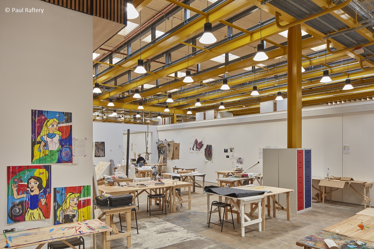 With an emphasis on ‘thinking through making’ the students and their creative practice were placed central to the overall design. The immense workshop facilities were located in the centre of the building to enable focused support from specialist technicians, and the ability for students to move seamlessly between materials and processes, whilst then allowing the mezzanine to be open and highly flexible.