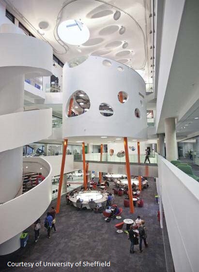 The ground floor has three access points to the central atrium with full-height glazing on the north and south edges giving internal views into the specialist engineering laboratories. The glazed apertures between the higher levels allow both the roof lights and daylight to flood into the open-plan study spaces below, whilst also creating acoustic separation.