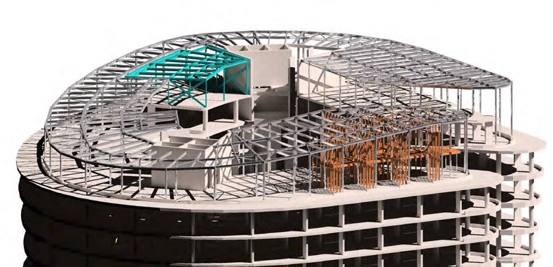 Level three of the scheme is essentially a transfer deck and the most crucial element of the project design as this is the main interface between the reinforced concrete residential zone and the steel-framed college below. Level three also supports a private roof garden that will only be accessible to residents.