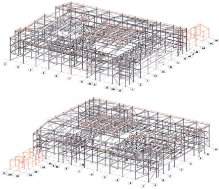 Overall the steel frame is stabilised by the two precast floors in the two teaching wings, which provide stiff plate diaphragm action, transferring lateral and notional forces to vertical steel bracing located within the perimeter and internal partition walls. Due to curtain wall, window and service penetration positioning, locating the bracing was challenging. A number of bracing techniques were utilised. Typically SHS/RHS bracing was adopted within the secondary steel zone in order to conceal it behind finishes.