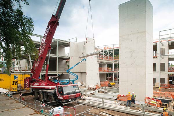 In the laboratory areas a steel frame supporting precast planks is utilised to accommodate the varying degrees of vibration due to the research equipment. The planks vary in depth, up to a maximum 350mm thickness, depending on the equipment to be installed and the soffits will be left exposed to optimise thermal mass, thereby helping to cool the building, explains Jon Sheppard, Aecom Project Engineer. “Although this was of secondary importance to the vibration issue.”