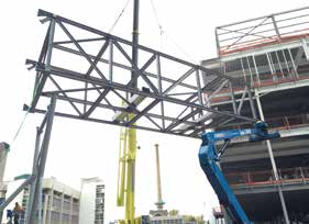 Two structural steel masonry lined cores provide the majority of the steelwork’s stability, along with bracing. The main core was installed as part of the first steel erection phase, as this then provided the steel erectors with sufficient temporary stability which all other areas of the structure could be erected from. Five phases, working to the full height of the building were needed to complete the structure.