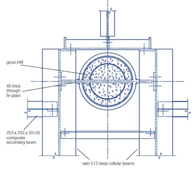fire protected steel column but have much higher capacity than similarly sized reinforced concrete elements because of the steel tubes and the high capacity of the concrete confined within the tubes. The columns were delivered to site in two three-storey lengths and joined by means of an in-situ concrete joint in the inner tube and by bolting and welding on the outer tube. The