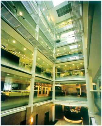services. Queensberry House in London, a six storey commercial building which is 30 x 50 metres on plan, is an elegant example of the type. In section, it provides clear spans of 12 metres on each side of the office divided by a 6 metres wide atrium, which contains all the internal columns. The columns make use of an innovative tube-in-tube system, in which one steel circular