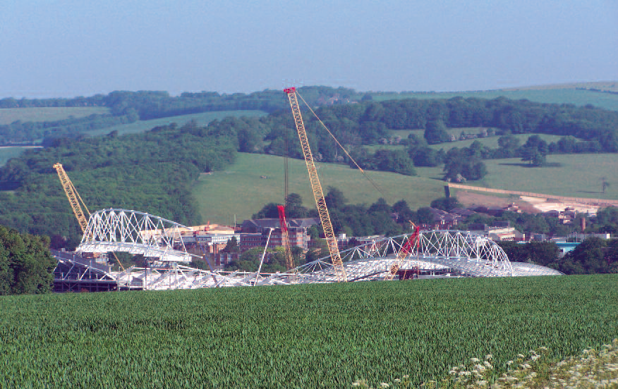The stadium comprises 4,200 tonnes of structural steelwork which was constructed between July 2009 and July 2010. The form and shape of the stadium evolved out of a direct response to the site and its topography. The curve and tilt of the roof, together with its arches, effectively replaces a mound of chalk that was scooped out to form the pitch and surrounding stands.