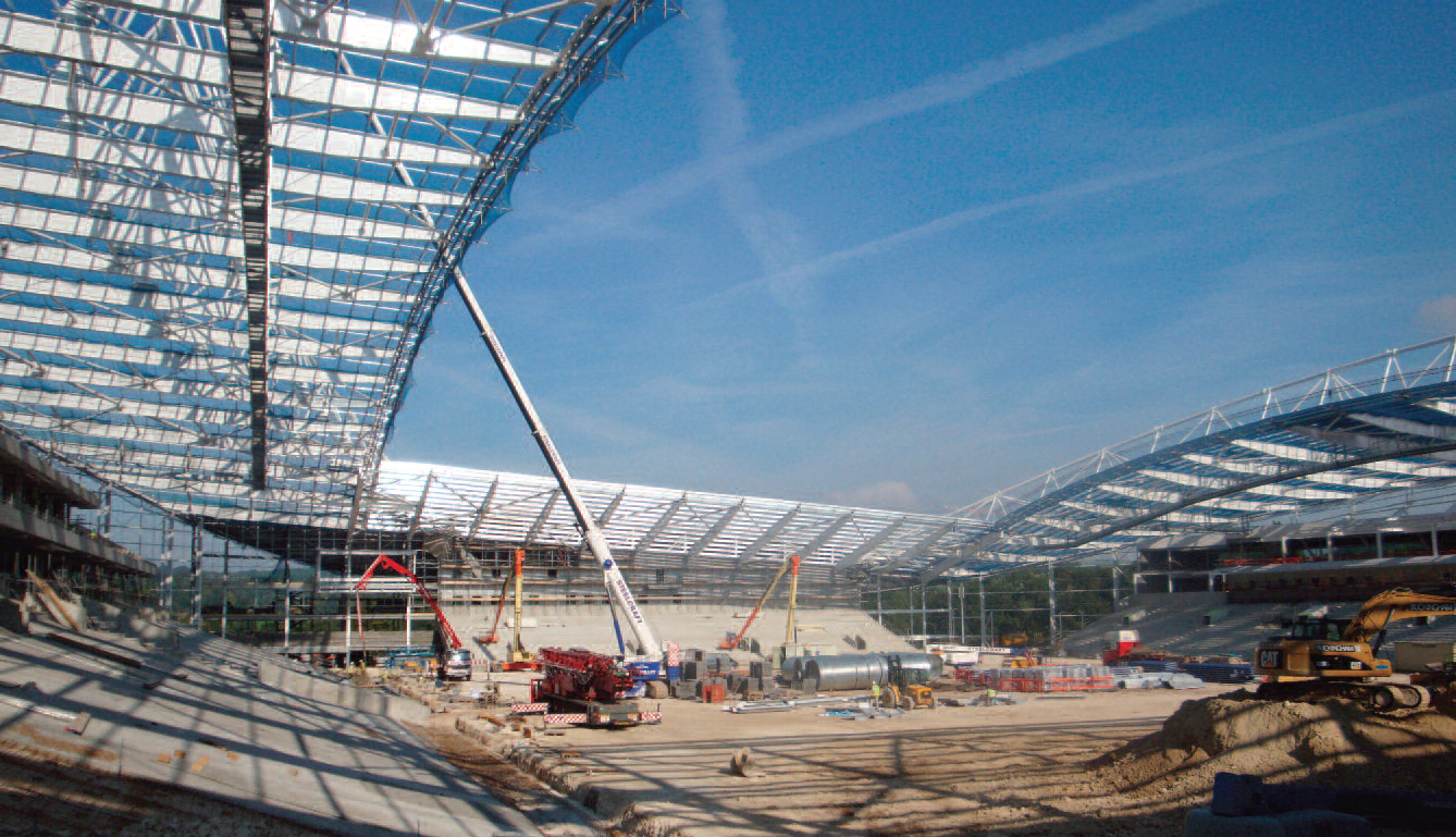 The 20MN thrust at the ends of each roof truss is transferred to the permanent concrete thrust walls by means of bearings, each of which weighs seven tonnes and is also engineered to cater for rotation of the roof trusses as they ‘flex’ in-service. The construction method was developed alongside the design. The objective was to pre-assemble as much as possible on the ground and minimize temporary works whilst, at the same time, ensuring that the temporary stresses induced within the lightweight roof did not exceed permissible limits.