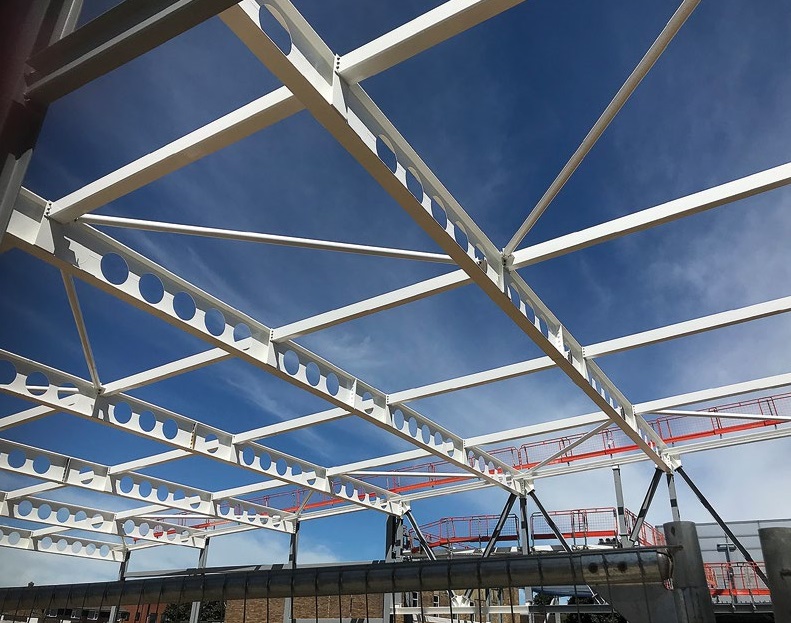 The longest cellular beams are a series of spliced 25.7m-long members that span the pool area. Too long to be transported as complete sections, the beams were brought to site in two pieces, which were spliced together on site, before being lifted into place. As the pool hall contains diving facilities, its roof and consequently, the height at which the cellular beams are positioned varies from 7.5m to a highest point (diving hall) of 11m. A truss with a maximum depth of 5.8m forms the step in the roof design.