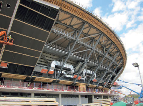 The air-handling units were integrated into the voids formed between the skeletal structure of the steel bowl, while the seating terraces were affixed directly to the inside of the bowl and the building cladding was fixed directly to the outside. This detailed coordination was achieved using 3D modelling software to precisely communicate the positioning of the services, architecture and steelwork in the limited space.
