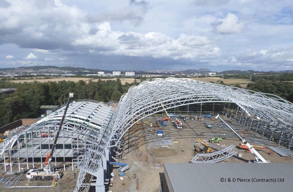 The sports hall roof comprises steel arches on a 7m grid, with straight secondary steel members spanning between the arches, and curved tertiary steel members spanning between secondary beams to provide intermediate support for the roof cladding. In this case, the original trapezoidal section was re-engineered to work as a standard UB section, further increasing the material and prefabrication savings.