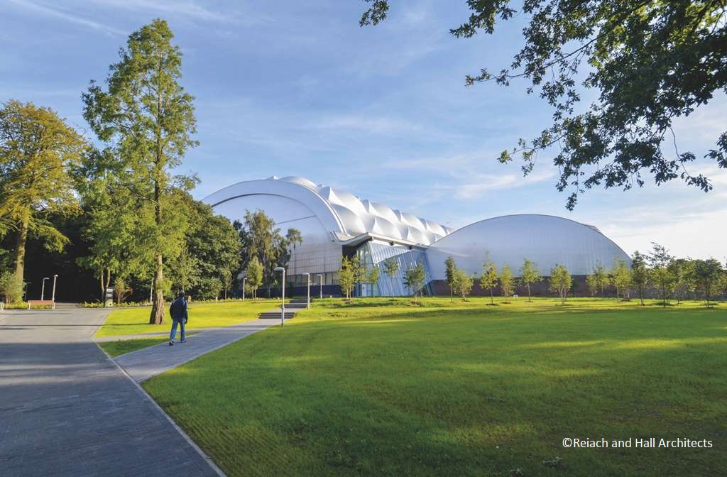 Two parallel vaulted forms spring from a central spine; the larger one covers a football pitch, whilst the smaller covers a sports hall. The elegant lightweight steel trusses resulted from a collaborative effort by the designers and contractor, with the construction methodology informing the roof structure and supports from which it springs.