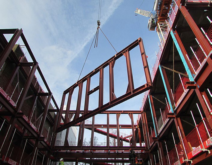 “Using structural steelwork was the obvious choice for this project as a lightweight frame was required because the Victoria underground line runs directly below the site, preventing any piling,’’ explains Conisbee Associate Denis Kealy. “We also needed a framing solution that could efficiently provide the long spans and column-free spaces within the building.”An 800mm-thick ground-bearing raft foundation was deemed to be the best solution for the site, onto which a concrete box basement was constructed, with the main steel frame starting at ground floor. Overall, the steel frame is braced for stability, with most of the bracing located in lift cores, as well as in one elevation that abuts an adjacent building and has no windows. Steelwork supports precast planks to form the floors and this solution was chosen as the underside of the flooring will be left exposed in the completed building, along with some steelwork elements, to fulfil the architectural vision.
