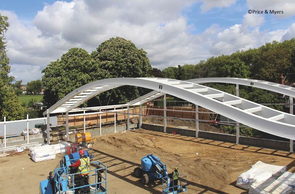 These arches support timber stress-skin panels, which span between the arches. The structure is predominately internal. However, where the structure becomes external, an offsite painted protection system with a life to first maintenance of 20 years has been used and, where necessary, with a decorative top coat. By using steel, the main elements could be fabricated offsite while the groundworks were completed. This prefabrication meant a fast erection process on-site and also assured a high quality finish – imperative as the majority of steelwork is left architecturally exposed.