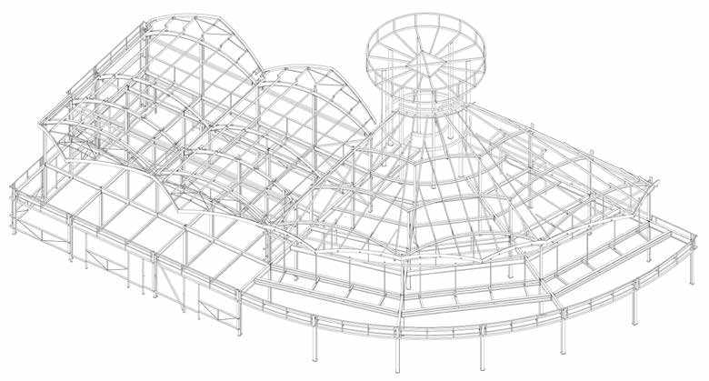 Steelwork for the 1,415m2 hospitality centre is based around a regular grid, albeit one that radiates inwards around a constant radius on one side of the structure to form the fan-like area. To form the roof of the fan, four rafters splay out from a central point, supporting the curved members that form the barrel-vault.