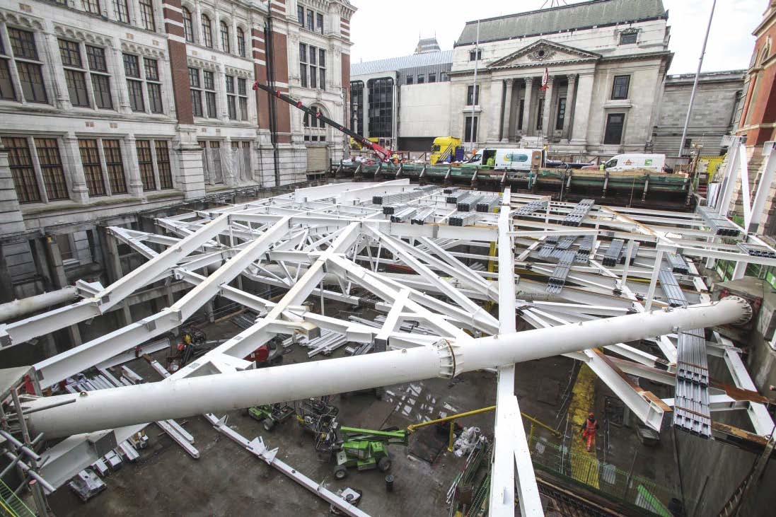 The inverted ‘Toblerone’ shaped trusses form a neat arrangement to support a new public courtyard and entry from Exhibition Road above new basement level galleries. This array of steelwork was hugely refined through the design process to maximise the efficiency of each member. Good use of light and colour for wayfinding in the new extension is exemplified by the striking red steel columns that so appealed to the judges.