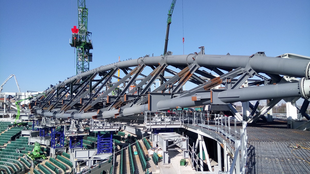 On site, not only were the existing cores used for permanent support of the fixed roof steelwork, they were also used as temporary support for the four tower cranes used during construction, for which they were temporarily post-tensioned.