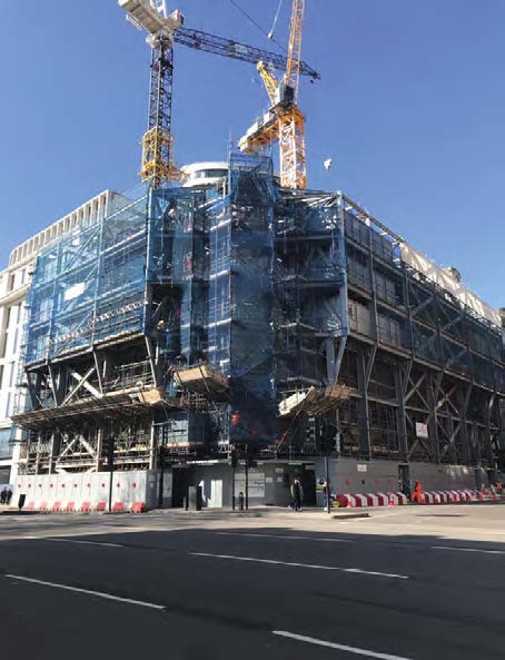 New steelwork connects to the retained façade steel columns via bolted connections and once complete, the new frame will support the old structure. “They are two separate structures; the steel frame is founded on new raft foundations, while the façade is on pad foundations. So, in order to accommodate any differential movement, they are joined by a sliding connection,” explains Mr Kingscote.