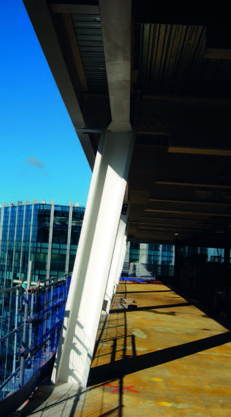 During the construction programme for the ground floor, a two-stage procedure was employed with the main steel columns being installed first. CHS shrouds were then slipped over the columns and grouted into place. These 9m-high columns weigh up to 30t with their shrouds and base plates.