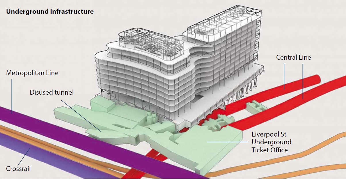 100 Liverpool Street, which forms an initial phase of the City’s Broadgate redevelopment, is a case in point as this site is situated adjacent to one of the nation’s busiest railway stations - Liverpool Street Station - with the terminus’s west entrance even passing through the site along with a shopping mall. Below ground a mass of infrastructure, including a Central Line tunnel, a disused Victorian tunnel, various access routes and substations are all present.