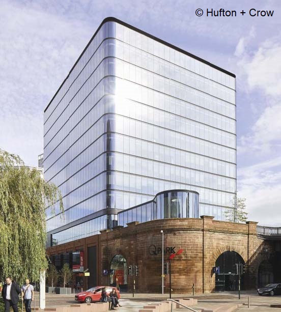 In contrast to the viaduct, the modern steel and glass office building appears as a lightweight, highly polished jewel offering over 165,000ft2 of Grade A offices on 10 floors above a 442-space car park podium over three floors.