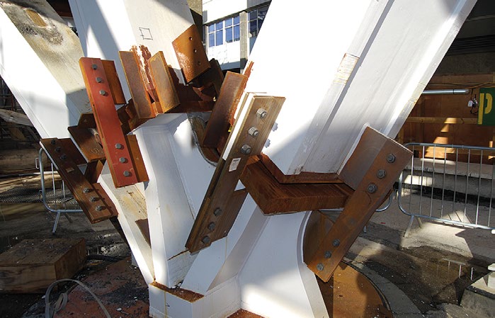 The tripod is fabricated from box sections and, as the name suggests, it has three arms that radiate outwards from its 10m-high top. The base is founded on a concrete column, which is positioned within the Crossrail ticket hall and was designed and constructed as part of the rail project’s package in preparation for an over-site development, completing the array of challenging site constraints.
