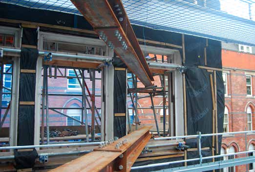The retained façades are supported by temporary propping systems around which the new steel frame was erected (pictured right). Once the floor slabs up to level four were cast and cured the façades were then tied into the new steel frame via a series of angles. After this the propping was removed as the façades were then supported by the steelwork.