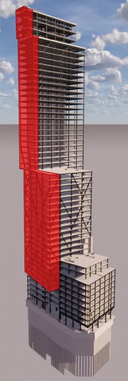 The western elevation overhang commences at level six and initially extends up to floor 26. This is the truss, and it forms a 5.5m-wide cantilever on the north, which increases to 9.5m wide at the south. Further cantilevers begin at level 26 and 48, with the former overhanging by up to 3.8m. This feature is formed by three inclined columns, sat atop the truss and extending up to level 30 (four floors), where they are tied into the steel frame and anchored into the diaphragm. Finally, the uppermost overhang at level 48 is created by two inclined columns, which extend up to floor 50, where they are also tied into the frame.