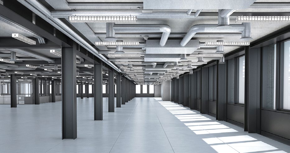 In certain areas, the orientation of the precast planks changes so that some beams support planks on one side only. These beams have been designed to carry the planks on their top flange and are 300mm deep to maintain the same level to the underside of the structure throughout the floorplate. The webs of these beams and of primary beams which cross the runs of services have been perforated where necessary to maintain the same zone for services everywhere.