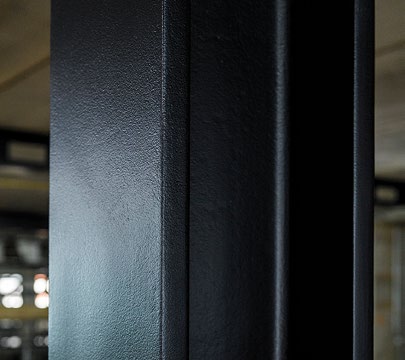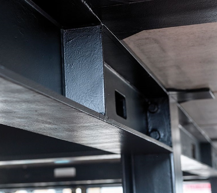 The steelwork is to be left exposed when complete and the detailing of the connections is simple and unfussy. Flush end plates have been adopted with toe plates in certain places. Some tie beams have also been provided with horizontal triangular fillets in the connection of their bottom flanges as an architectural feature. Fire protection requirements for beams which pass through compartment walls and for beams with top flanges at floor level were optimised using computational heat transfer modelling. The structure has a 90-minute fire resistance period and is provided with intumescent paint pigmented with a dark grey colour to add to the industrial feel of the space.
