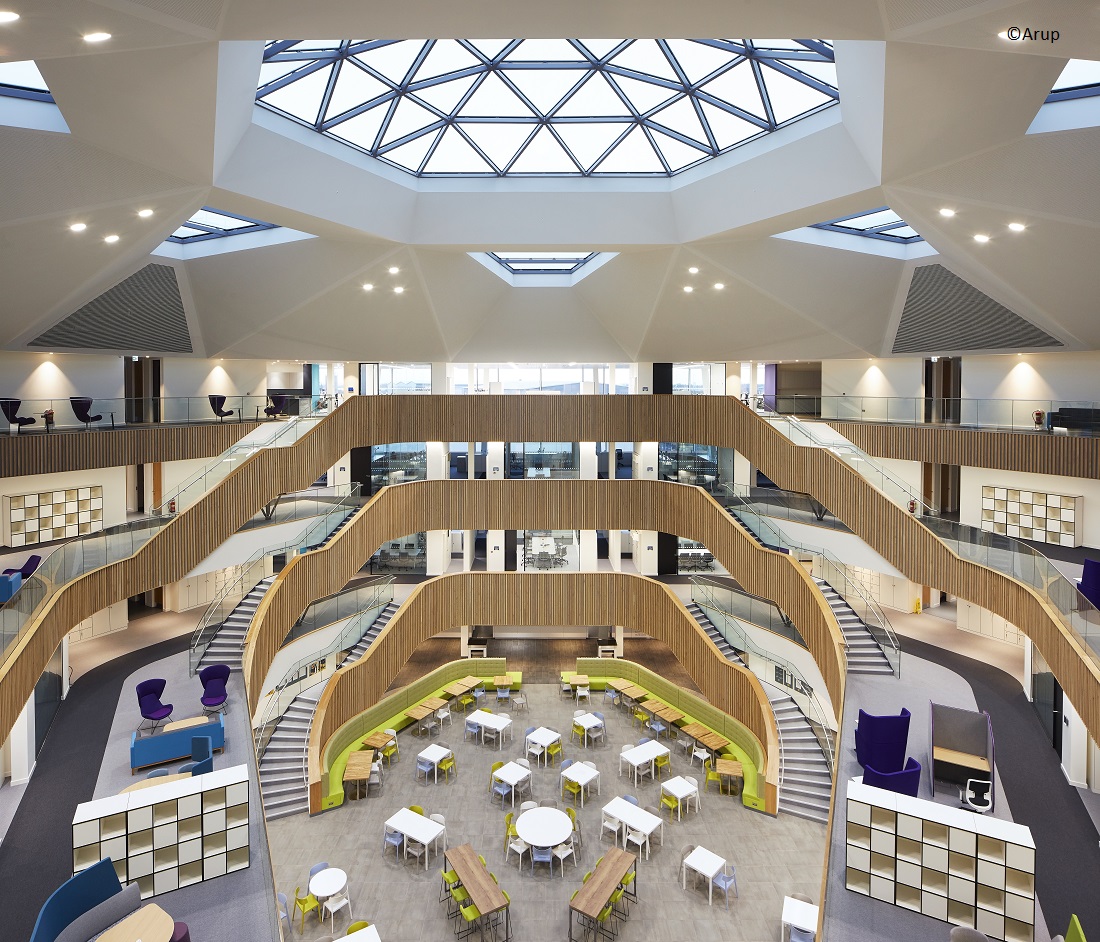 The building layout has been designed to optimise the space planning, orientation and form to reduce energy consumption, minimise overheating and maximise natural daylighting, thus achieving a BREEAM ‘Excellent’ rating. The stepped façade creates shelter to glazed elevations, with narrow floorplates and a terraced internal atrium enabling maximum daylight penetration into the space. The terraces promote enhanced interaction of staff through visible connections, and provide vibrant collaboration spaces arranged around the atrium. The atrium roof itself is an elegant and stunning centrepiece to crown a building designed to inspire.