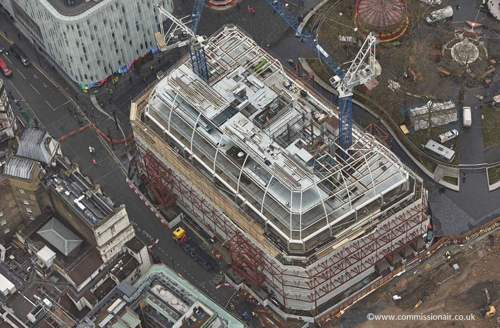 The existing building envelope is partially retained with new upper storeys of commercial floor space being provided. The design delivers two basements, two floors of retail space and seven floors of high quality office space with a new entrance on Whitcomb Street. Upper floors are enclosed by a new curved mansard roof. On the lower floors, new retail space has created active frontages at street level with new, clearly defined entrances.