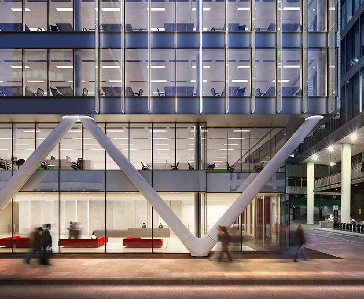 The building’s west facing wedge-like form responds to the rights to light of the residents in the Barbican. Its height is limited by the St Paul’s viewing corridor and the choice of structural strategy was influenced by the need to avoid conflicts with Crossrail tunnelling that partially overlaps the site’s footprint.