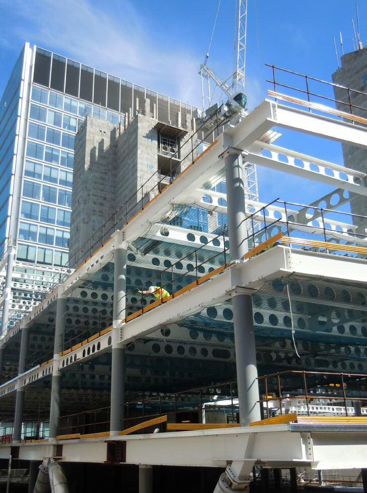 The steel frame was designed to be erected close behind the slip formed cores, which provided stability to the structure. Provision for a tower crane through the floor plates was included in the base floor design, and the design of the columns was closely coordinated with the steelwork contractor’s preferred splice connections.