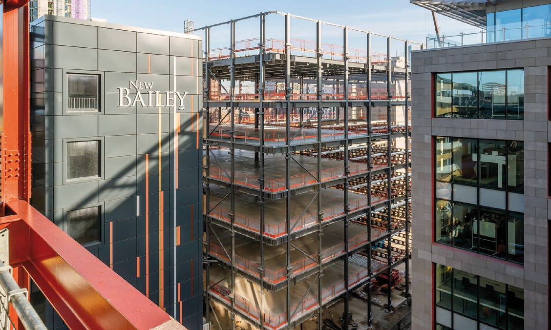 Bowmer + Kirkland is one of the main contractors for the scheme. Its work has so far included three steel-framed commercial blocks and a Premier Inn hotel. The latter structure was completed before the dig got underway as it sits slightly outside of the footprint of the former prison walls. Of the office buildings, One New Bailey was completed in 2017 (with Billington Structures as steelwork contractor) and currently the firm is building units Two and Three. A fourth office building is also on the drawing board, as part of the masterplan.