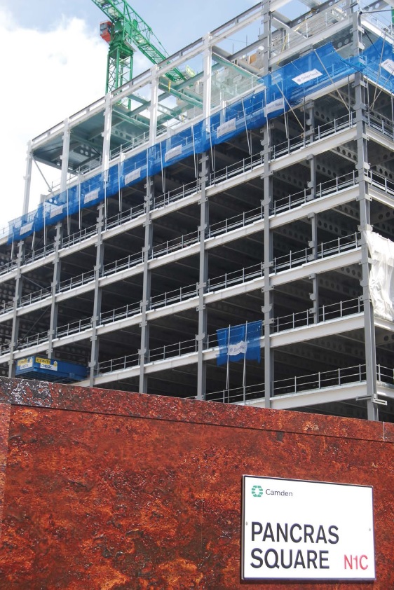 One of the initial phases of this huge and ambitious development is Pancras Square. Located between the busy rail terminals of King’s Cross and St Pancras International, the scheme will consist of seven retail and commercial buildings positioned around a wedge-shaped public square. Interestingly Pancras Square’s central landscaped realm sits on top of a steel podium deck (see NSC January 2013) that accommodates an underground, shared delivery space for all of the buildings. Five of Pancras Square’s buildings have been completed so far, with the final two – both of which are steel-framed – currently at different stages of construction.