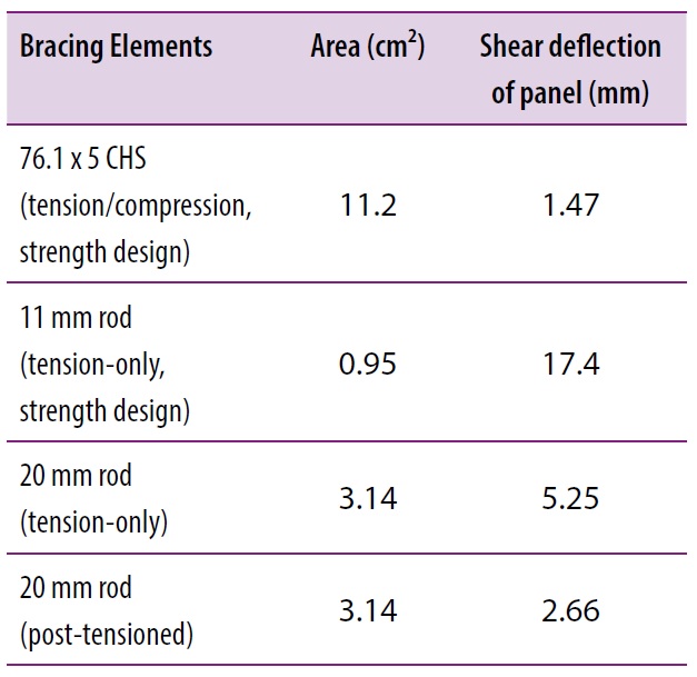 As an illustration, the shear deflection of a hypothetical 3.5 m square braced panel transferring 35 kN, consisting of 203UKC46 columns and a 305×127UKB37 beam with different bracing systems is compared in the table (right).