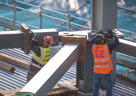 An existing access route to the basement loading bay necessitated steelwork contractor Severfield to design, fabricate and erect a structure dubbed the ‘Rhino’ truss because of its shape. “This is circa 150t in weight and was erected using two tower cranes. We had to get a special dispensation from the manufacturer to uprate the cranes for the erection of this truss,” explains Severfield Project Manager Kyle Fletcher. “It is made up of site bolted booms, nodes and diagonals, with the heaviest node weighing approximately 20t.”
