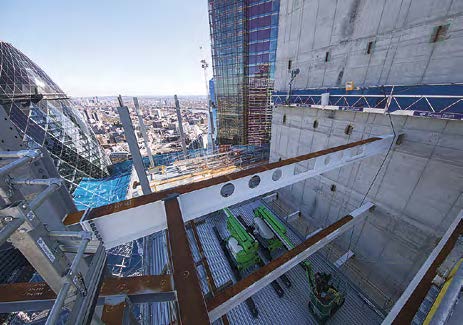 As there are outrigger sections embedded within the concrete core, steelwork contractor Severfield had to design, fabricate and deliver these elements well in advance of the main steelwork. Once the steelwork and floors were installed up to levels 25 and then 41, the V-shaped trusses were installed either side of the core and connected to plates left exposed from the elements inside the concrete core.