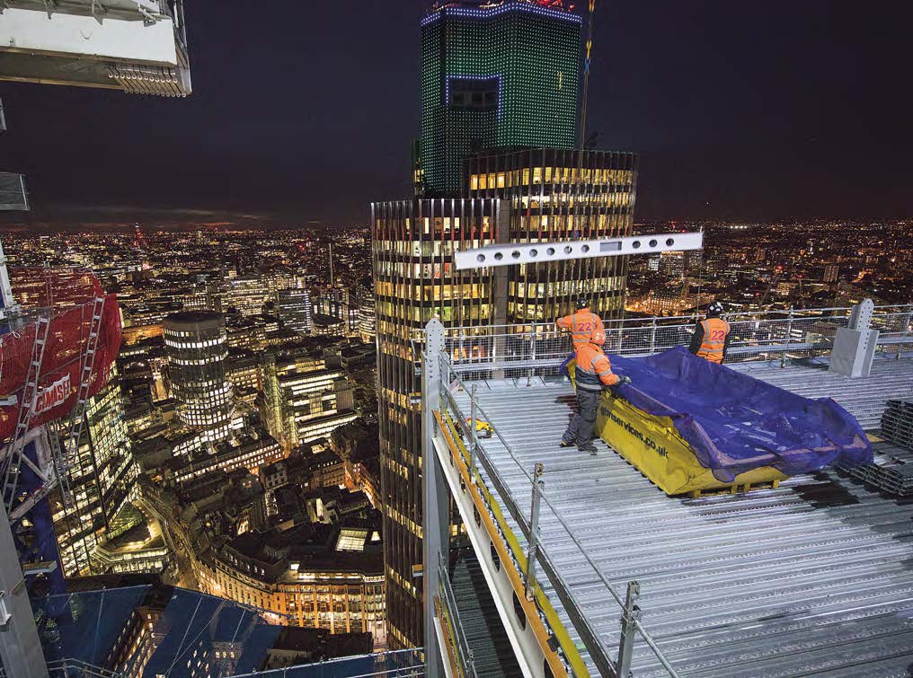 Wind is the one weather element that can occasionally delay a steel erection programme that relies on craneage, and wind speeds generally increase with height so it has more of an effect on tall buildings. However, what is surprising about this scheme is that the high winds that have occasionally suspended crane duties have mostly been encountered at low levels along the main Bishopsgate thoroughfare.