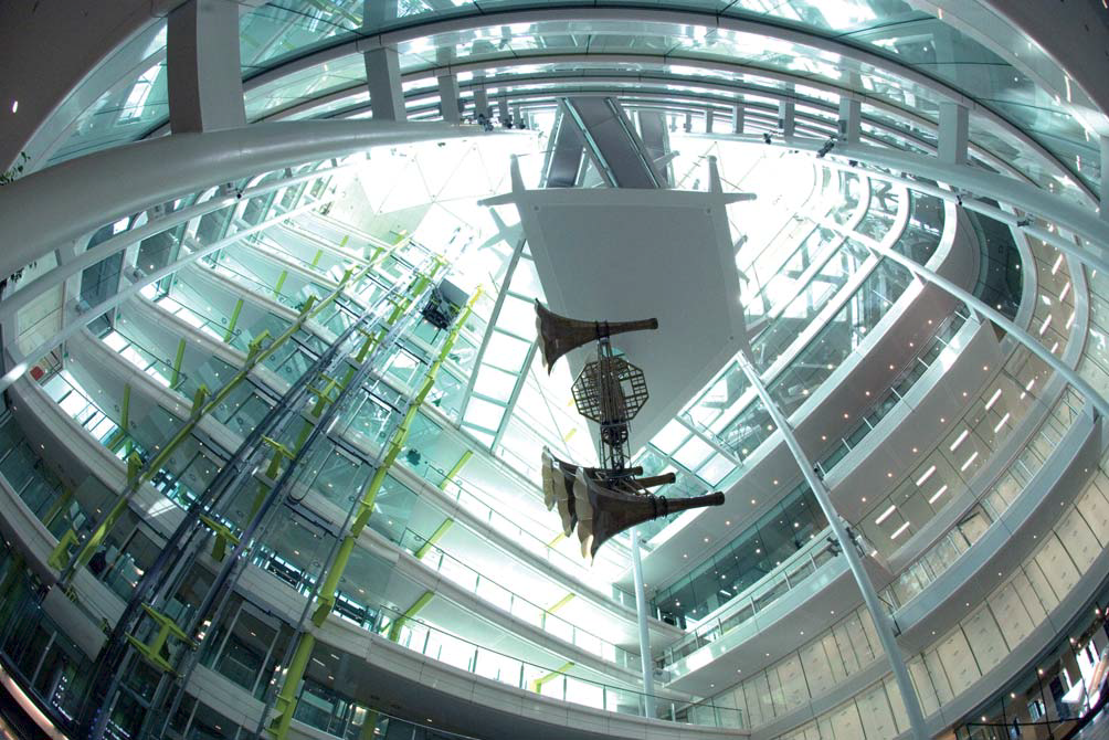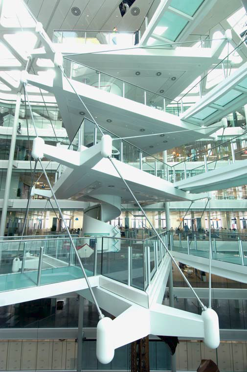 Looking upward from the ground floor each of the four "Flying Carpets" differs in shape and orientation, and each was pre-fabricated in William Hare's workshops and transported to site in two pieces to be site welded after alignment. The hanger systems are fabricated from duplex rods more commonly used in the yacht-building industry, with each containing a bulletshaped node end formed from a steel casting.