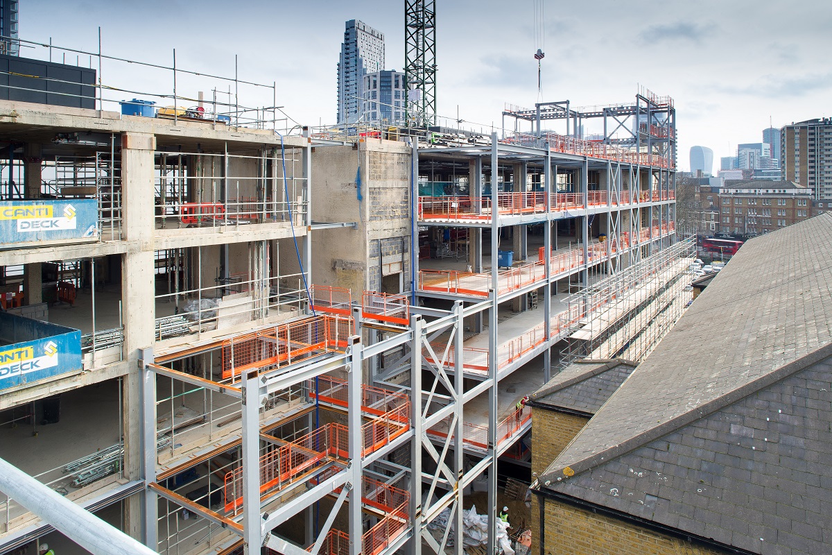 A good example of sustainable construction. By using steel to open up an existing building, extend it upwards and outwards with a lightweight frame, this 1980’s concrete office building has been repurposed with a 40% increase in floor area and greater flexibility. Reusing the existing frame and foundations saved 2,450 tonnes of embodied carbon compared with building new.