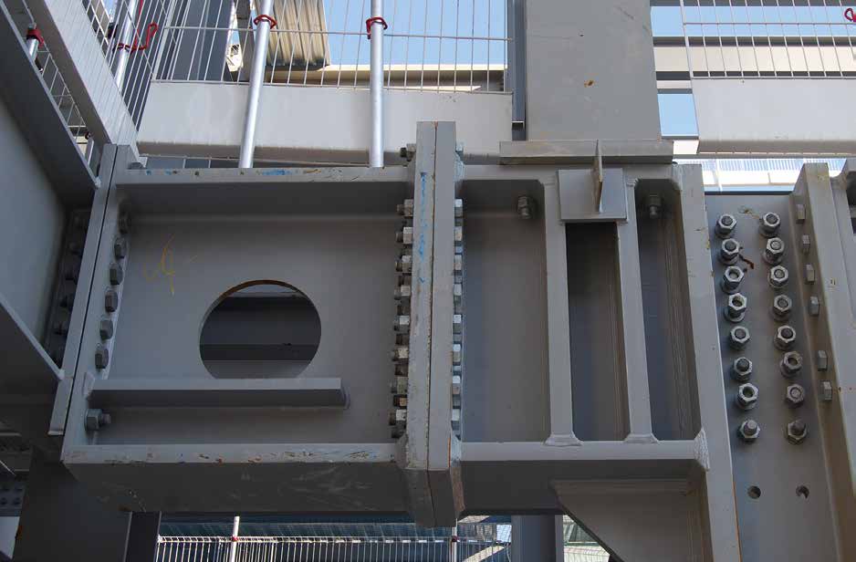 The plate girders are not the largest steel members on the site, these are a series of 1,450mm-deep × 1,020mm-wide × 25m-long beams, each weighing 38t that form the main service yard.